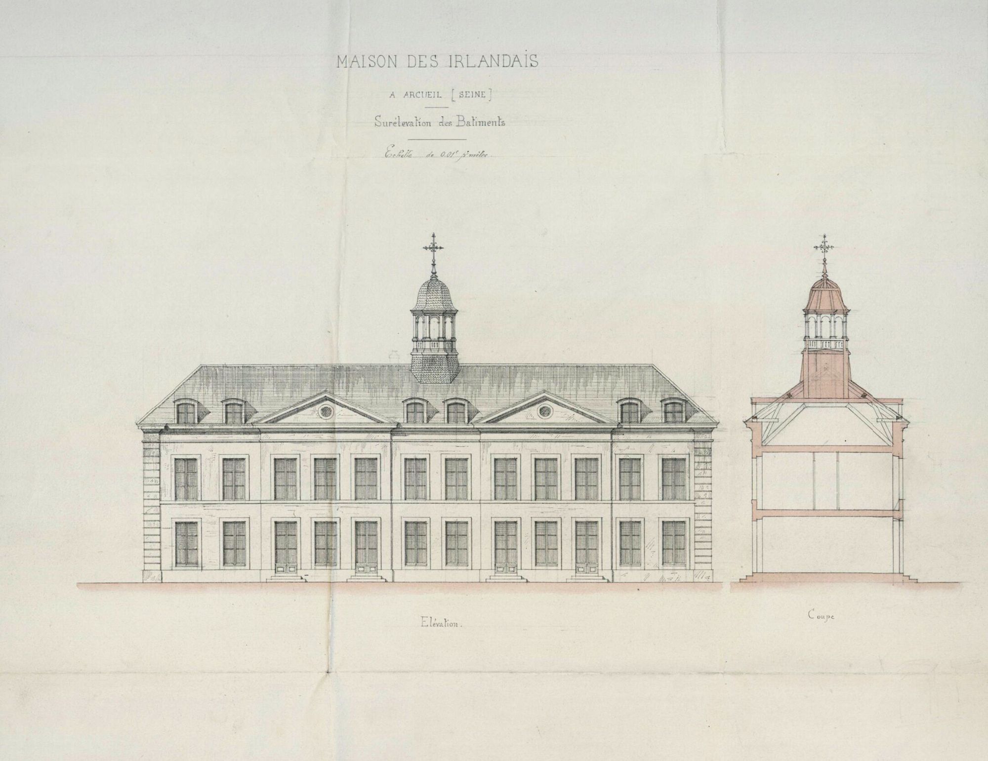 - la maison de campagne d'Arcueil, dont une étude manuscrite du domaine, à l'encre et au lavis, des bâtiments, cours, jardins et parcs qui composaient le Collège des Irlandais d'Arcueil. Il s'agit d'un recueil complet avec trois plans et un dessin de la façade de la maison de campagne avec, sur la première page, une note explicative de Charles Ouin-la-Croix, 1872 (Arcueil, plans, A4.f3).