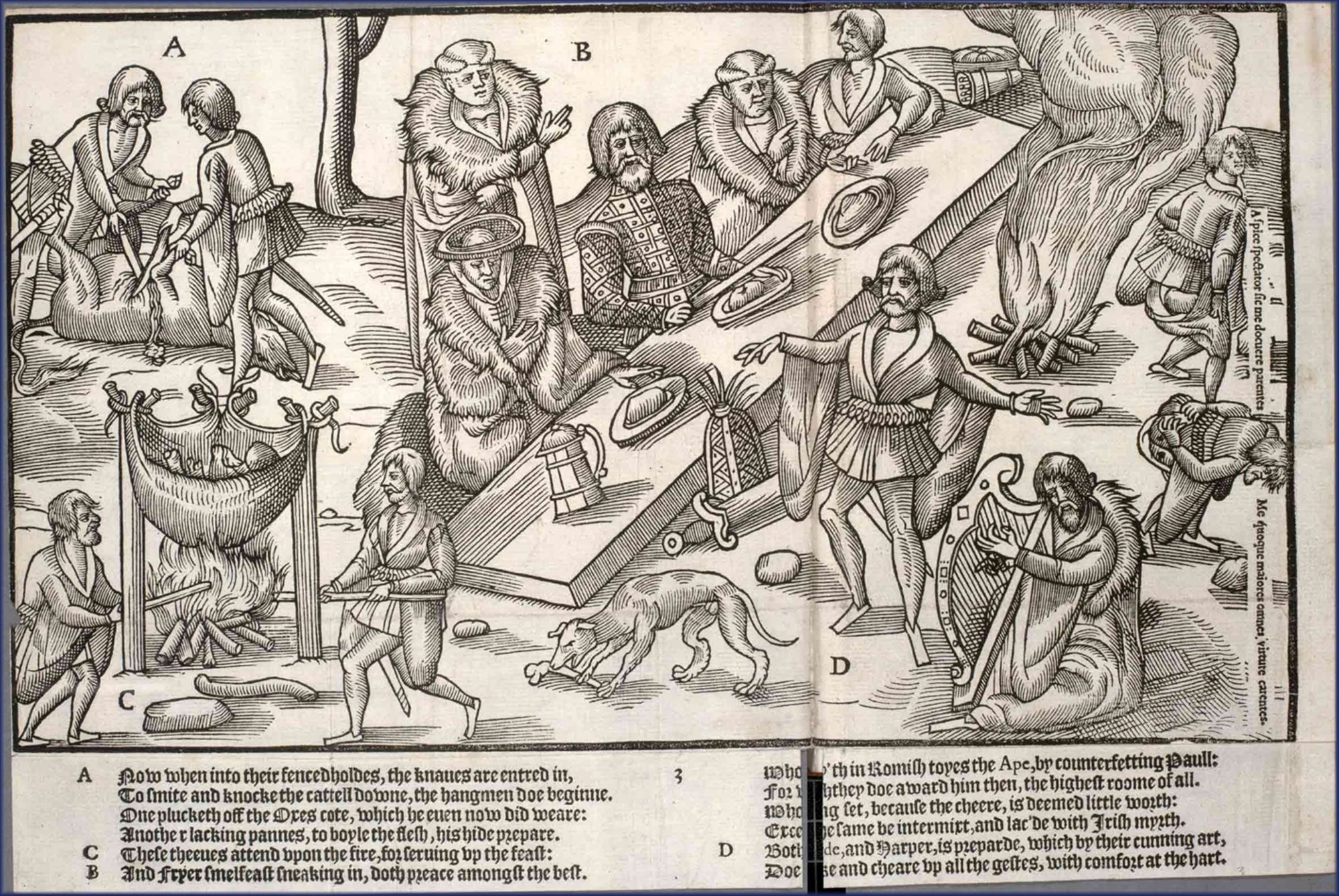 Une scène de banquet chez un chef irlandais, dans The Image of Irelande, with a Discoverie of Woodkarne 1581.