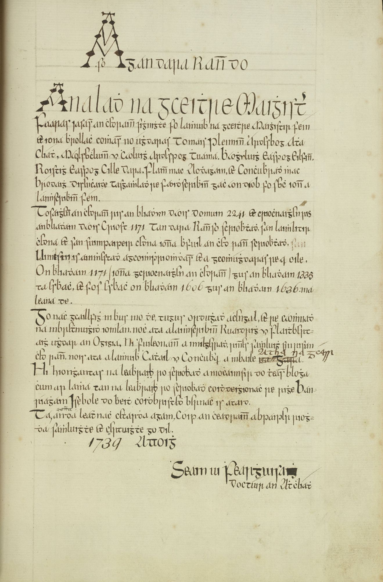 Les Annales des quatre maîtres est une œuvre importante de l'histoire irlandaise, copiée et transmise internationalement parmi les différents centres de savoir irlandais au 17esiècle.