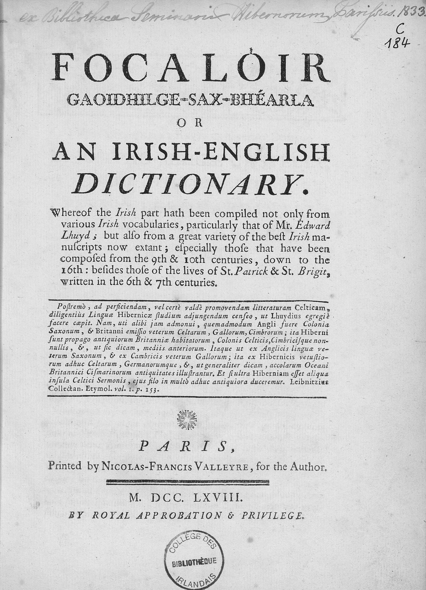 De son côté, le Collège des Irlandais de Paris (site de l'actuel Centre Culturel Irlandais) possède une riche collection de textes en langue irlandaise hérités de ce réseau continental. Certains d’entre eux ont été numérisés, tels que le dictionnaire irlandais-anglais de John O’BrienFocalóir gaoidhilge sax-Bhéarla, imprimé à Paris en 1768, et une édition bilingue de l’Iliade d’Homère avec une traduction en irlandais, imprimée en 1844.