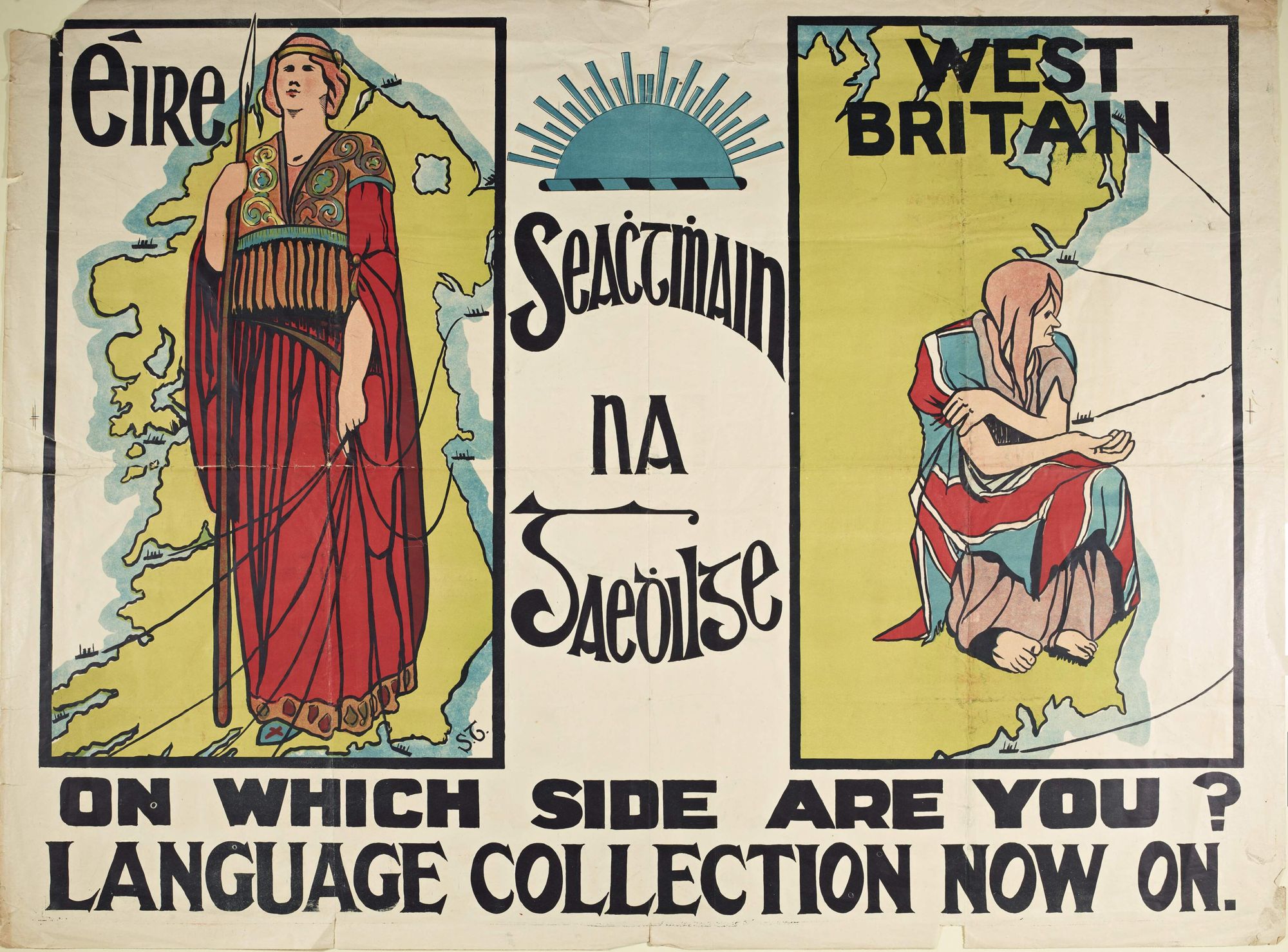 Le 19e siècle est marqué par un changement radical : l'anglais devient la langue la plus parlée dans la majeure partie de l'Irlande, à l'exception de certaines régions, principalement dans les zones rurales de l'ouest et du sud. L'introduction du système scolaire national en 1831, qui institue un programme scolaire excluant la langue, l'histoire et le patrimoine irlandais, a un impact considérable en associant la notion de progrès et d’opportunité au monolinguisme anglophone. Parallèlement, les famines dévastatrices qui frappent l'Irlande tout au long du siècle entraînent une baisse d'environ 25% de la population totale en raison d'une mortalité et d'une émigration généralisées, et frappent de manière disproportionnée les régions de langue irlandaise.