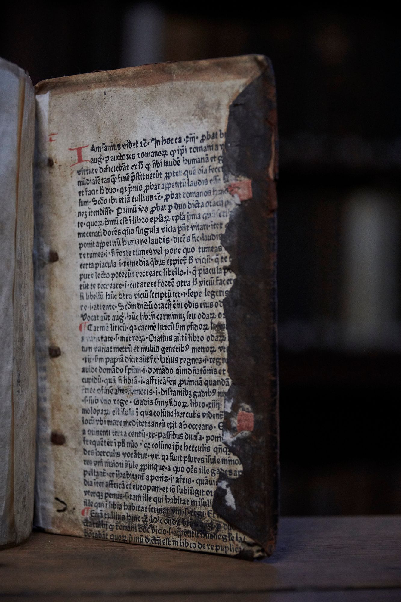 Dans cette reliure se cachent des fragments d'un incunable, le plus ancien livre imprimé de la bibliothèque. Imprimée à Bâle en 1479, cette édition de La Cité de Dieu de saint Augustin avait perdu de sa valeur au milieu du XVIe siècle. La page exposée témoigne aussi de la pratique courante de rehausser à la main les initiales dans les premiers livres imprimés - pratique non sans dangers, puisqu’ici l’enlumineur a, par erreur, inséré un I plutôt qu’un N.