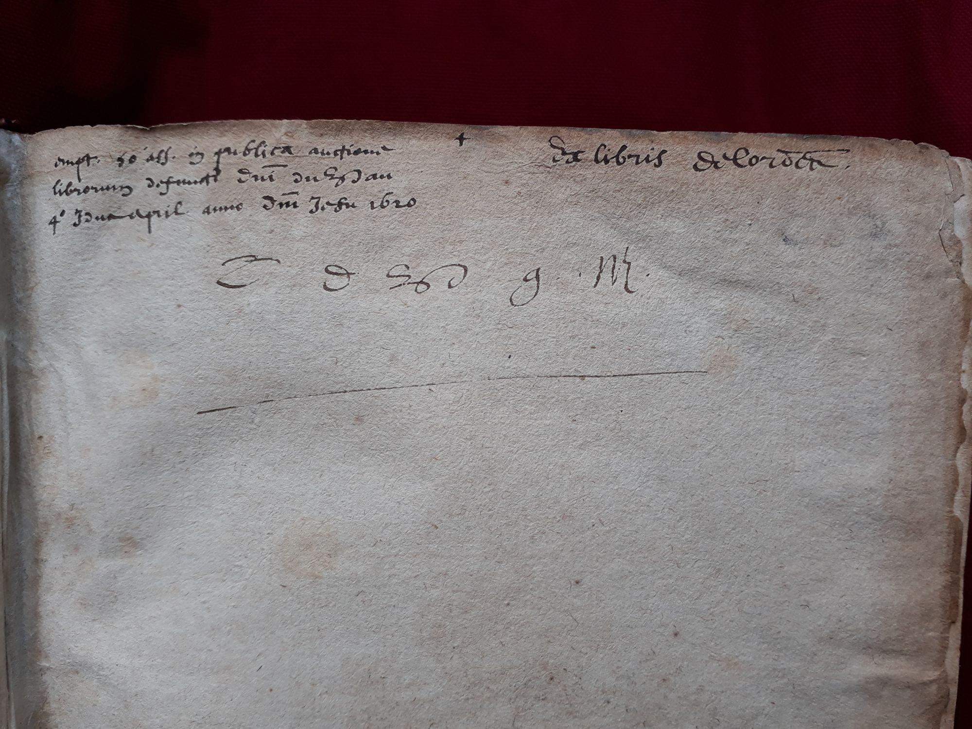 L’inscription latine, placée en haut de la page de droite de ce volume, illustre la diversité des façons d’acquérir un livre à la Renaissance. Un acquéreur n’était pas toujours obligé de passer par la boutique du libraire. La note manuscrite indique en effet que l’ouvrage fut acheté pour 50 sous en 1620 « in publica auctione librorum » (« pendant une vente publique aux enchères ») qui eut lieu après la mort de son premier possesseur.