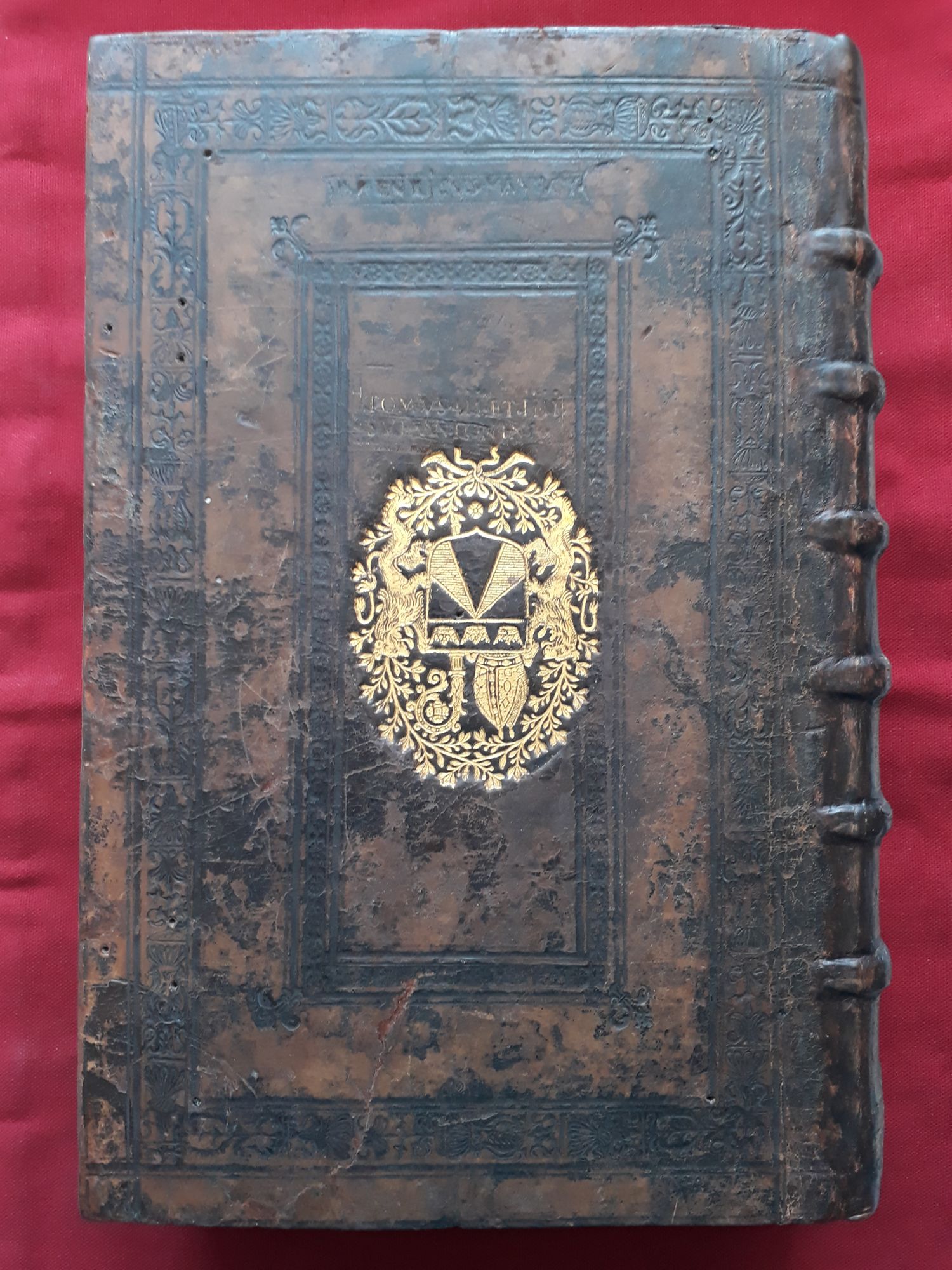 Cet exemplaire illustre la détermination de possesseurs successifs à s’approprier un livre. Au XVIe siècle ce volume appartenait au théologien controversé Henri Mauroy qui fit apposer son nom sur la reliure. L’évêque Léonor d’Estampes de Valençay l’acquit ensuite et fit marteler le nom du possesseur précédent pour y substituer ses armes... Mais la fierté de l’acquéreur est rabattue par un détail un peu cocasse : le relieur appliqua le fer à l’envers.