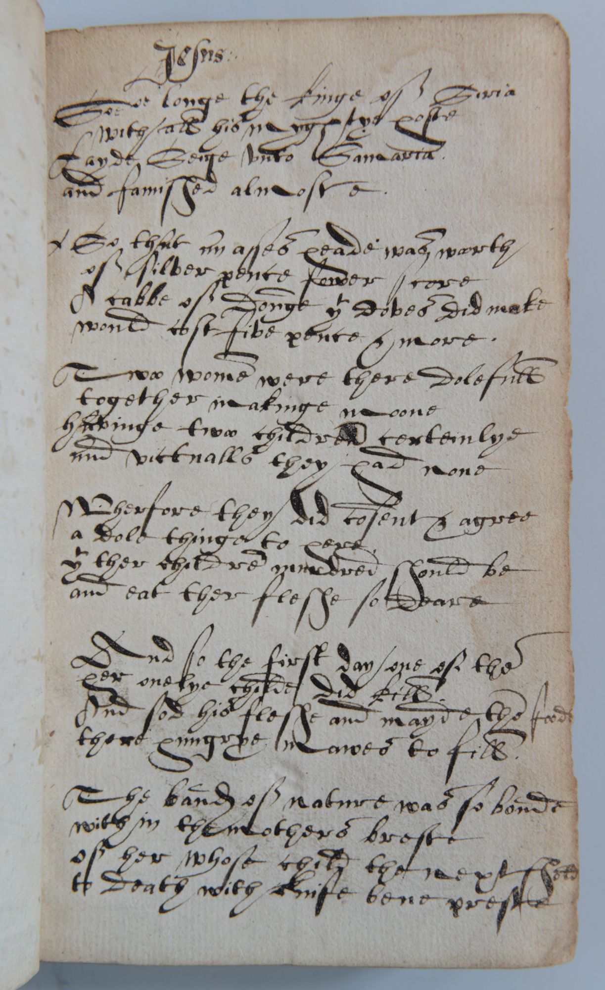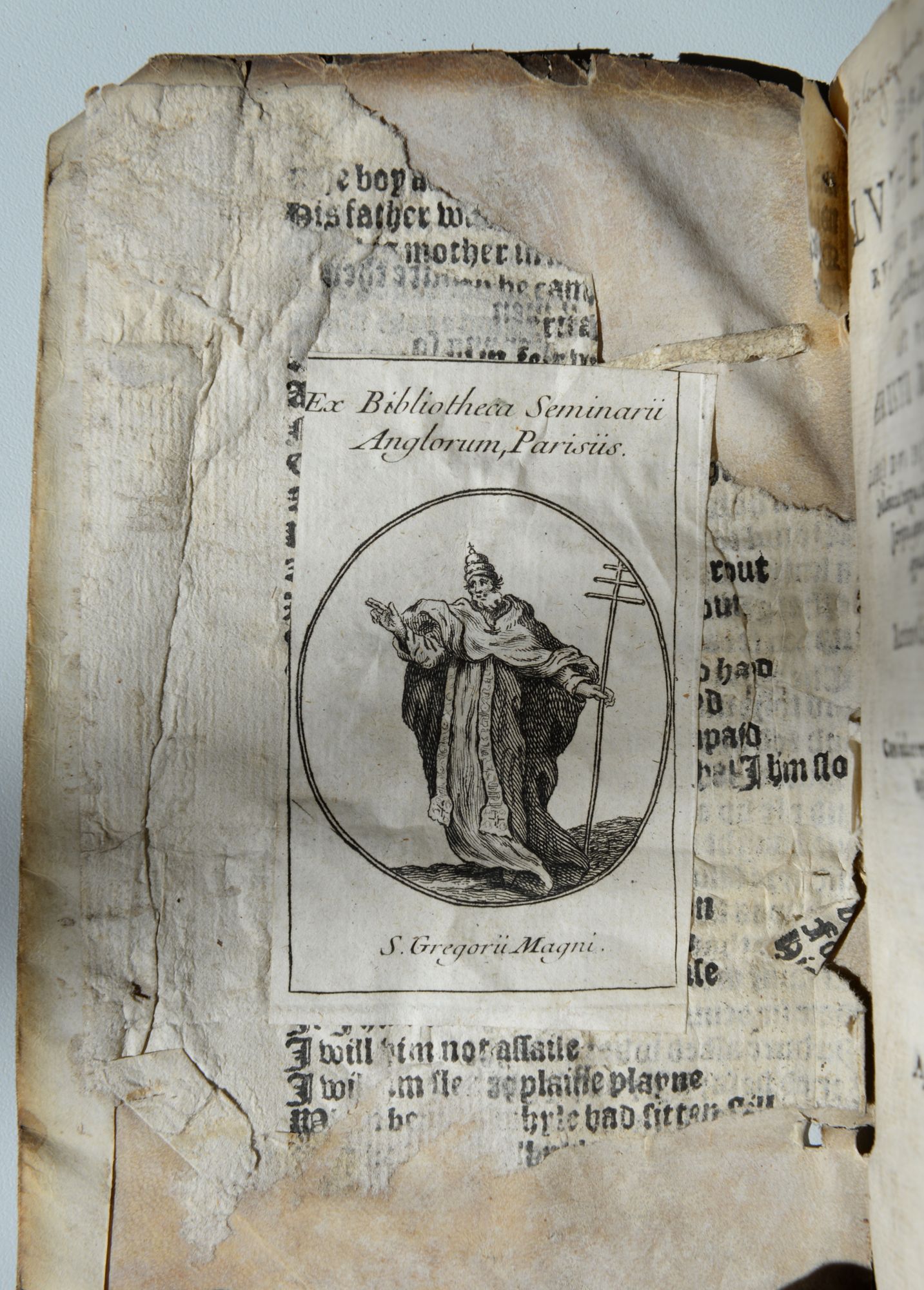 Les feuilles de textes jugés sans intérêt étaient insérées pour renforcer la reliure. Elles représentent une source d’information fascinante. Il s’agit ici d’un livre pieux anglais. Ce type d’édition était monnaie courante à la Renaissance et se vendait par milliers. Mais la popularité même de ces livres les rend très rares : on les utilisait tellement qu’ils finissaient en piteux état. Ce fragment est, désormais, le seul témoin de cette édition.