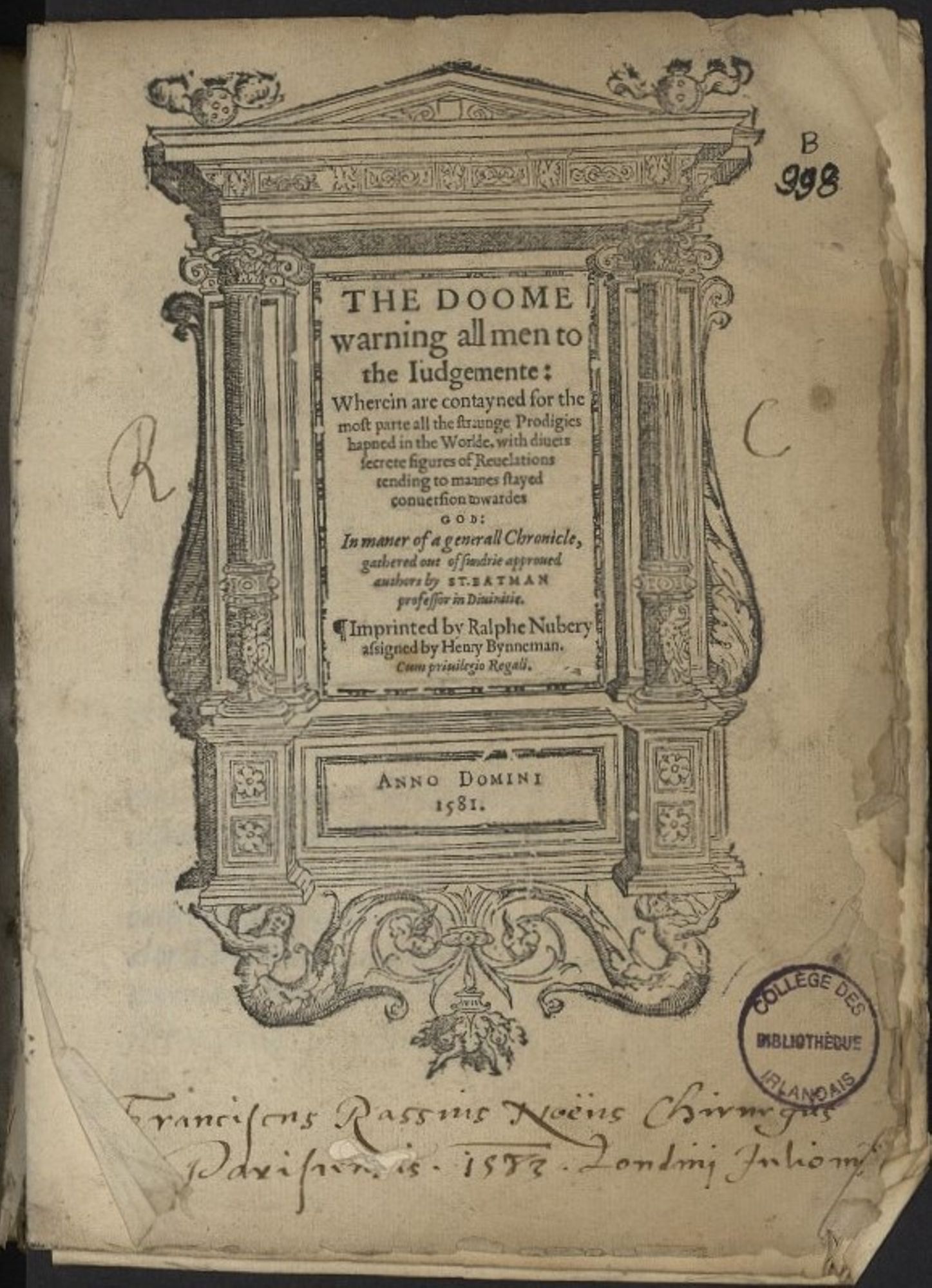 K. Lykosthenes, The doome warning all men to the judgemente, Londres : Henry Bynneman pour Henry Bynneman, 1581, USTC 509327 – B 998.