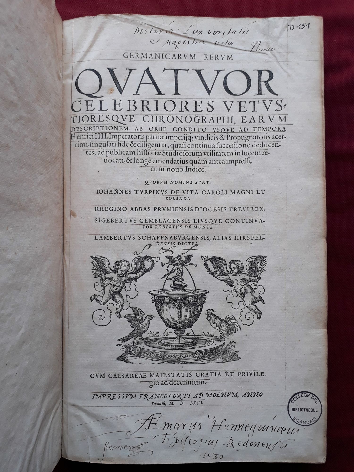 Aymar Hennequin, évêque de Rennes, fut l’un des principaux opposants à Henri IV avant sa conversion au catholicisme. Mais son intellect en fit une figure incontournable et le roi le nomma archevêque de Reims en 1594. Ce livre souligne son amour de l’histoire avec cette paraphrase de Cicéron : Historia lux veritatis et magistra vitae (« Histoire, lumière de vérité et maîtresse de vie »).