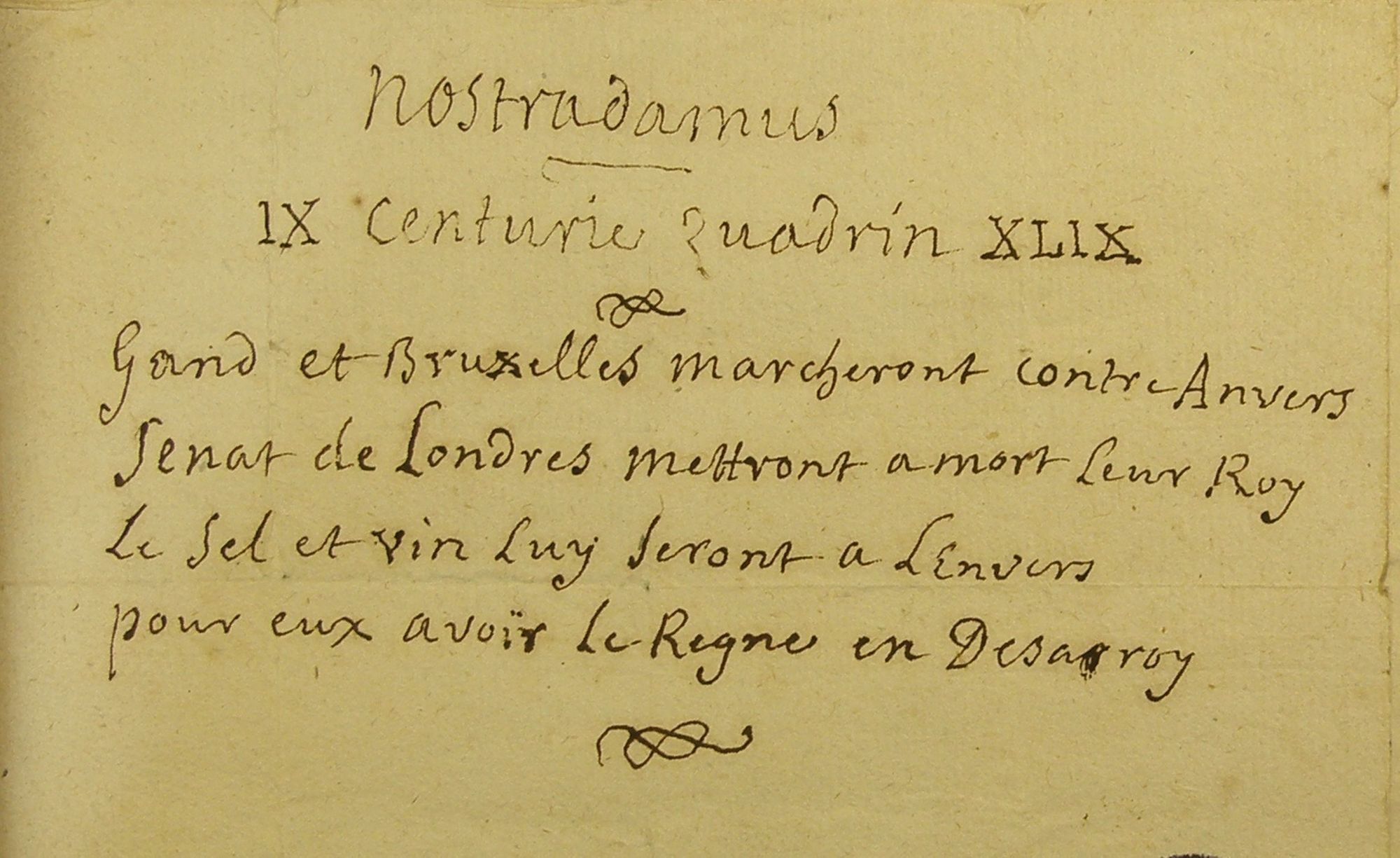 Cette prophétie de Nostradamus (1503-1566) est réputée annoncer l'exécution de Charles Ier d'Angleterre (1649). Pourquoi a-t-elle été placée en tête d'un volume des Censures et conclusions de la faculté de Paris (1717) traitant de la fidélité des sujets à leur roi, de la sécurité des souverains et de la tranquillité de l'Etat ? Le rapprochement jette en tout cas un sérieux doute sur l'efficacité des garanties institutionnelles.