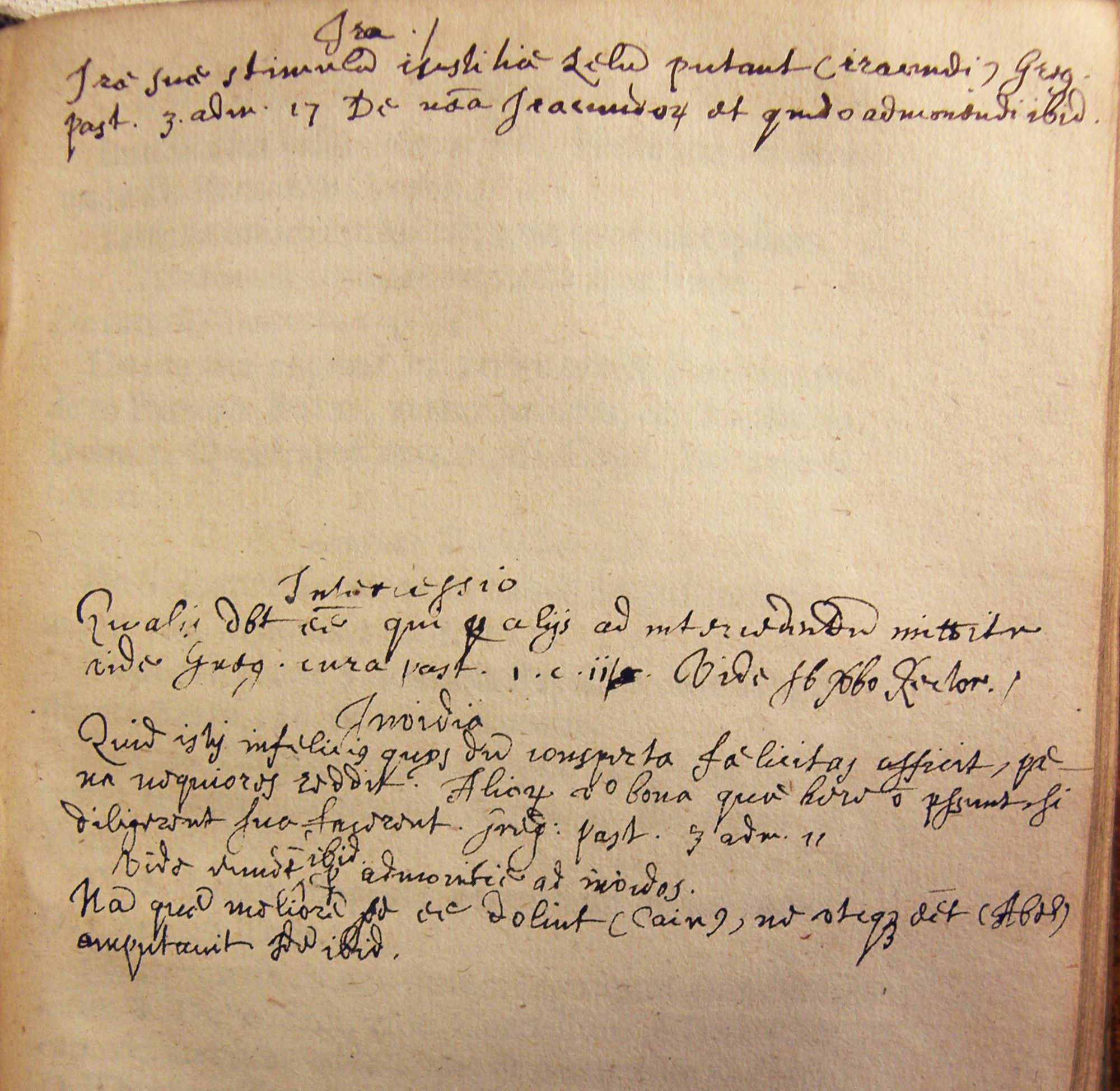 Sur le Thesaurus locorum communium, répertoire à destination des prédicateurs, le lecteur a complété le texte de trente-sept nouvelles rubriques, comme ici ira (colère), intercessio, indivia (envie). Ses annotations éclairent la composition de sa bibliothèque de travail, formée de la Bible, des Pères de l'Eglise et des auteurs de l'Antiquité. L'ouvrage le plus utilisé est le traité De pastorali cura de saint Grégoire (146 occurrences !), consciencieusement lu et réparti entre les rubriques.