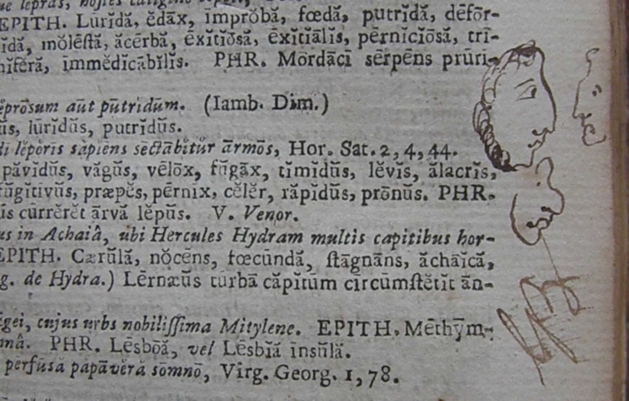De très nombreux amis des adolescents ont apposé leur signature sur les marges du Gradus. Le volume porte la marque des amitiés et des rivalités, des attirances et des tensions. Ici, « Miss De Voirez allez en enfer » !