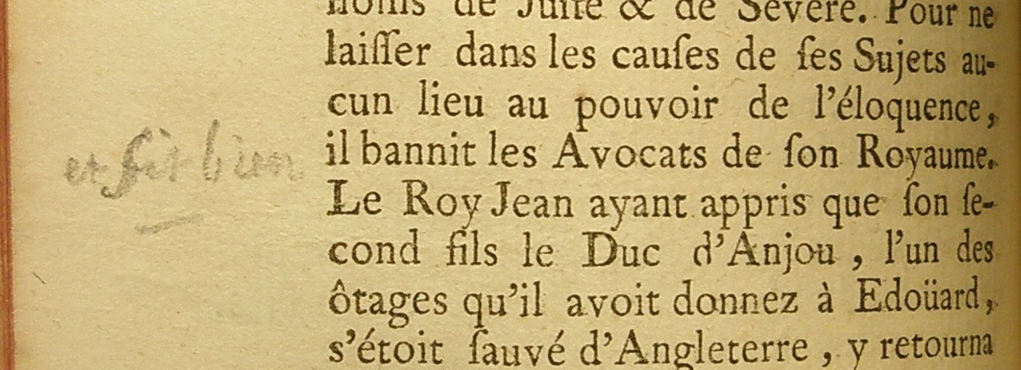 « Et fit bien », annote le lecteur de la Suite de l'histoire universelle de Bossuet, en face du récit de la vie de Don Pedro de Portugal, qui bannit les avocats de son royaume. C'est la seule annotation écrite du volume.