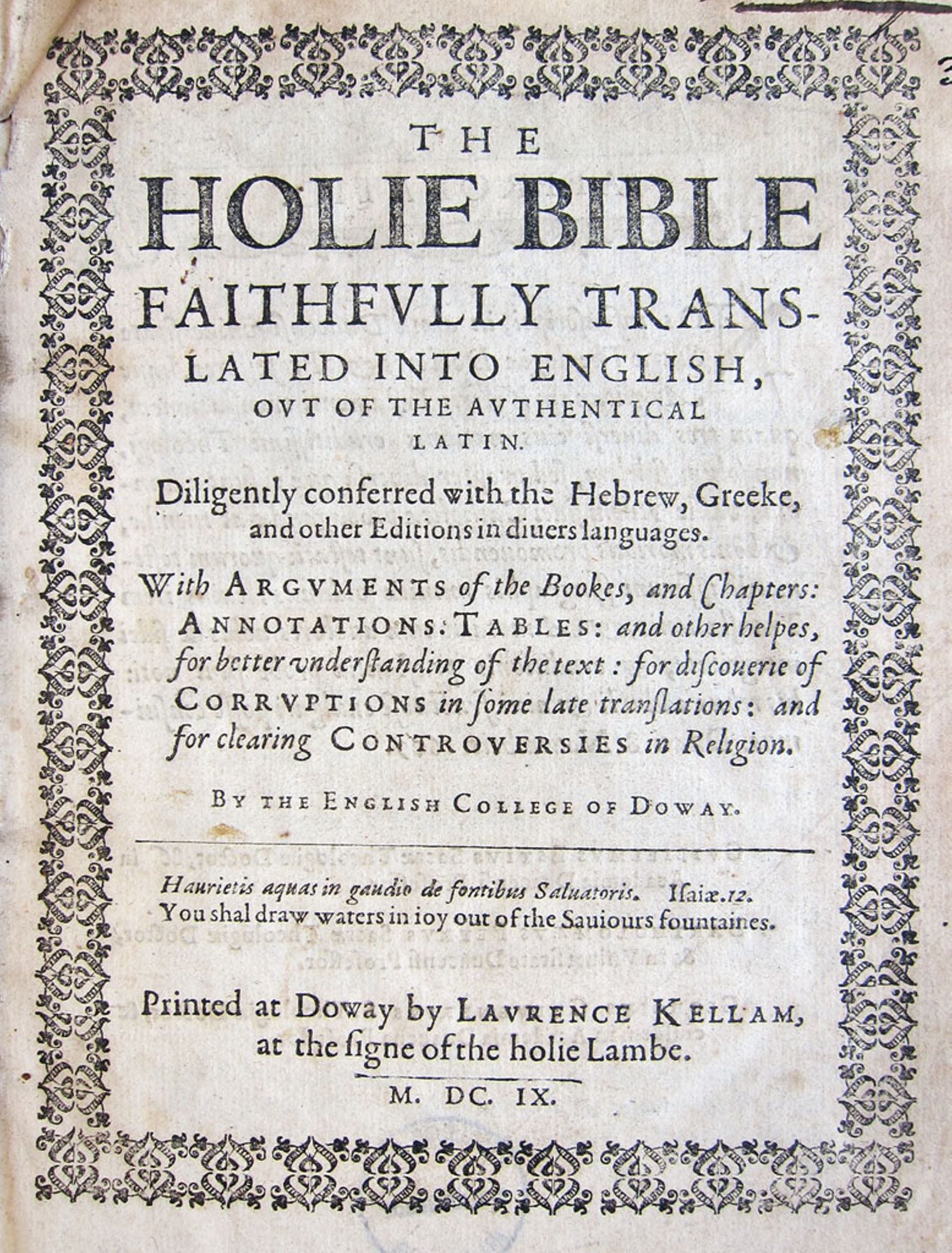 L'Église catholique tient pour sacrée la Bible en latin. Selon le pape Paul V (1552-1621), « trop lire les Écritures nuit à la religion catholique ». La Réforme protestante semblait lui donner raison mais souleva une question de taille. Comment des missionnaires éduqués dans des collèges comme ceux de Douai et Paris pouvaient-ils accomplir leur mission de conversion en Angleterre, Irlande et Écosse sans une Bible en anglais ?