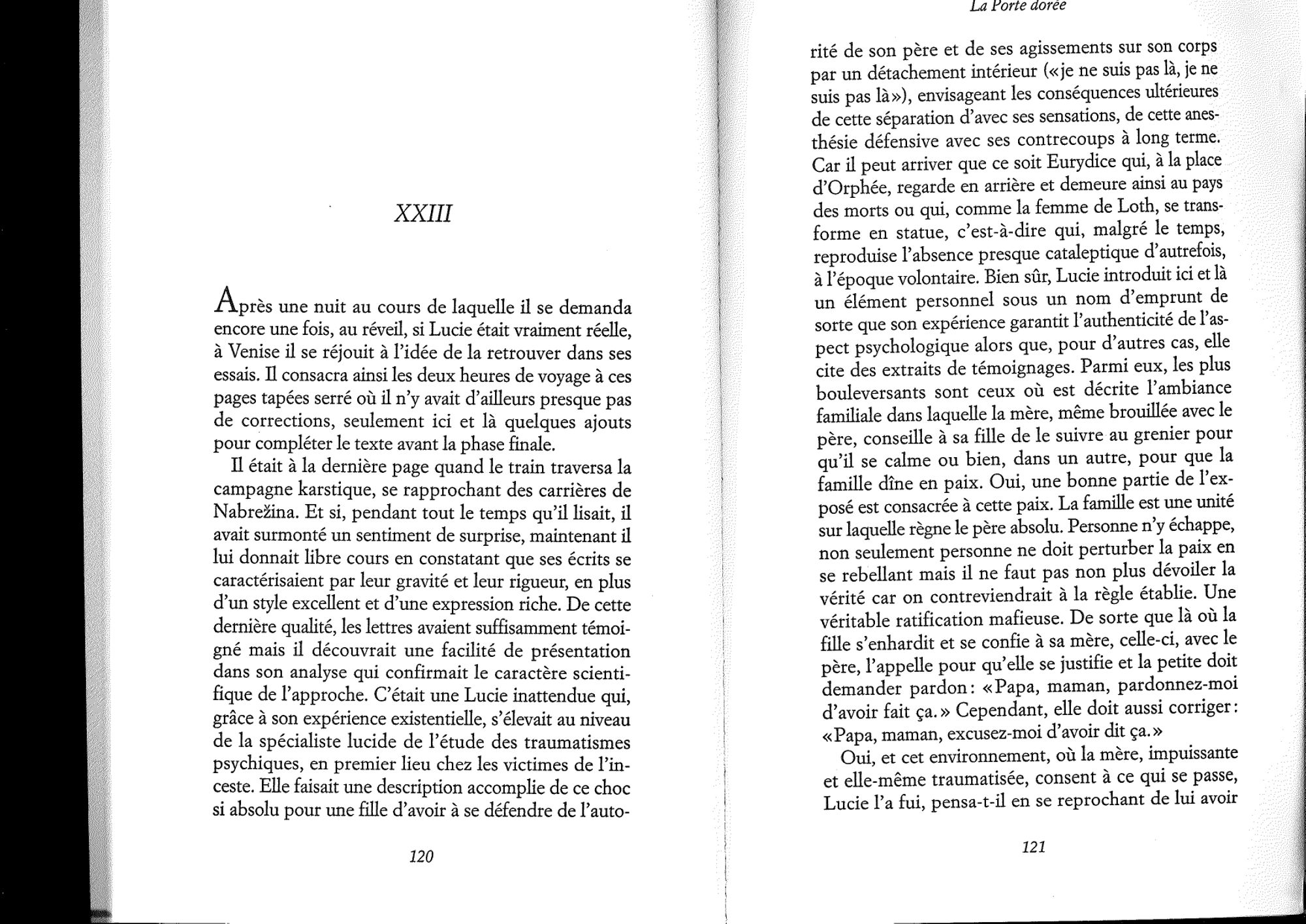 « La Porte dorée » est l'autofiction d'un écrivain slovène qui a connu les camps d'extermination nazi. Depuis, il témoigne pour ceux qui n'en sont pas revenus. Quand il reçoit la première lettre de Lucie Huet, il est en train de rédiger un essai sur le traitement narratif de la guerre dans la littérature. Une correspondance s'engage entre l'homme mûr et la jeune femme, laquelle fait parfois allusion à une expérience douloureuse, indicible, qui l'a marquée à jamais. À l'occasion d'un séjour à Paris, ils se rencontrent. Ils marchent dans la ville et discutent : quel mal est-il possible de comparer aux camps d'extermination ? Bientôt, ils deviendront amants et Lucie se confiera : fillette, elle a été victime d'inceste, « autre forme du mal absolu ».