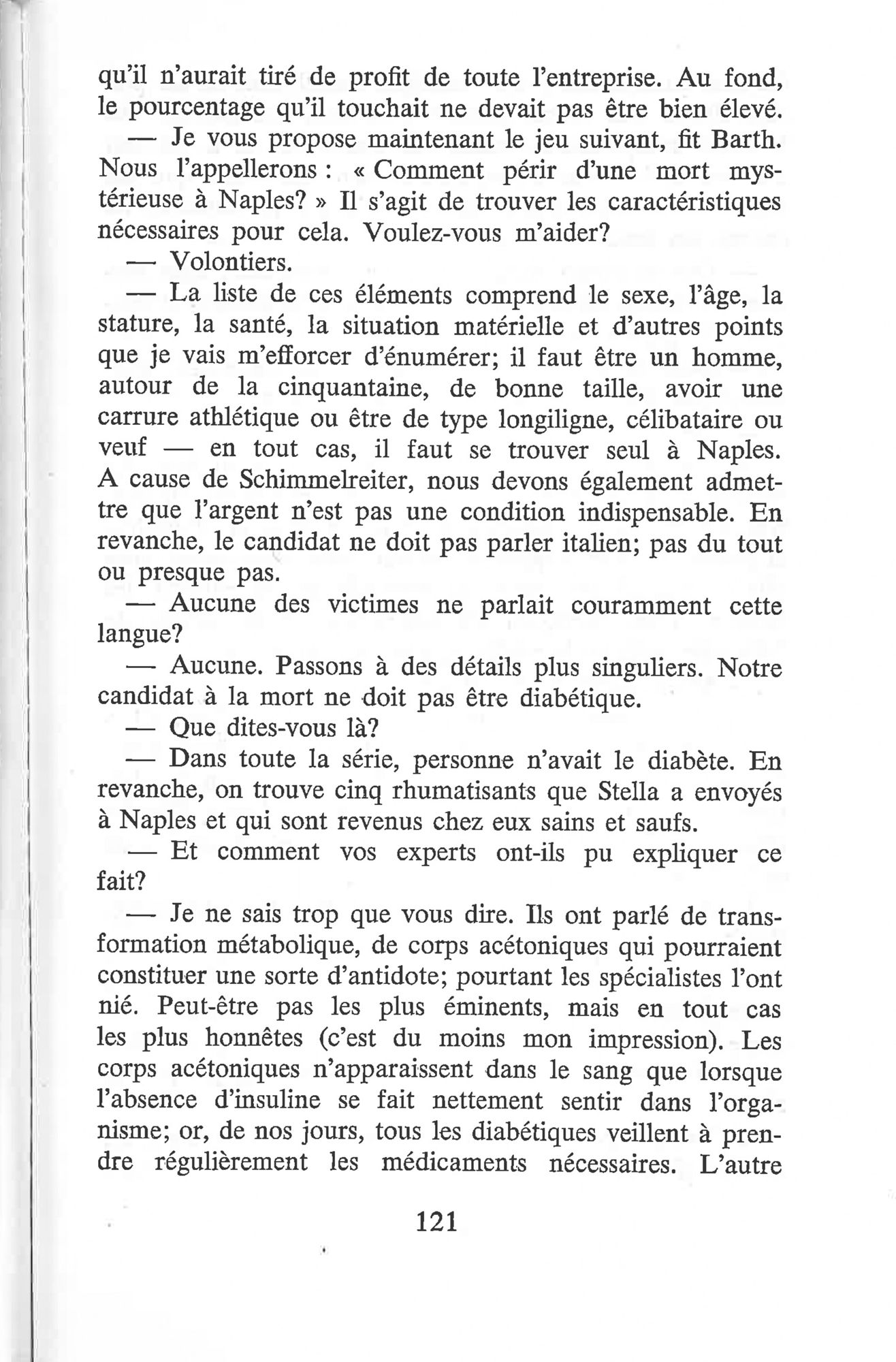 Je ne sais trop que vous dire. Ils ont parlé de transformation métabolique, de corps acétoniques qui pourraient constituer une sorte d’antidote ; pourtant les spécialistes l’ont nié. Peut-être pas les plus éminents, mais en tout cas les plus honnêtes (c’est du moins mon impression). Les corps acétoniques n’apparaissent dans le sang que lorsque absence d’insuline se fait nettement sentir dans l’organisme ; or, de nos jours, tous les diabétiques veillent à prendre régulièrement les médicaments nécessaires. L’autre élément indispensable est l’allergie. Sensibilisation au pollen, rhume des foins, asthme. Pourtant, certains de nos hommes remplissaient toutes ces conditions et il ne leur est rien arrivé. Par exemple, ce client de Stella que j’ai baptisé « l’homme aux fraises » et l’autre qui souffrait du rhume des foins.