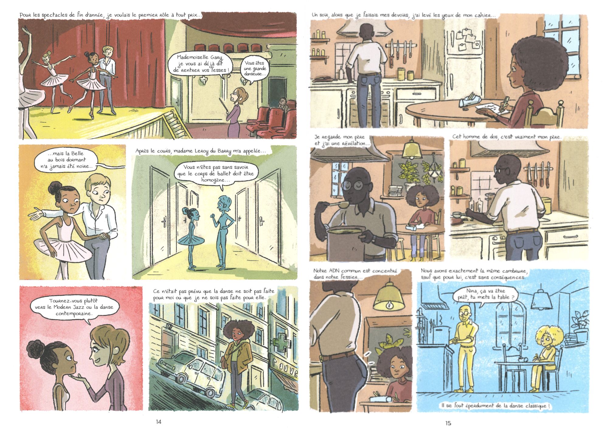 C’est une maison où personne n’a rien à voir avec personne. Je parle au-delà de l’amour que nous éprouvons les uns pour les autres, même si, chacun a vraiment sa manière de l’exprimer. Si je me résume, je ne comprenais pas du tout ce que je faisais là. Papa est noir comme mon sac de danse, mama est pale comme mon collant, couleur chair. […] À l’époque, je me disais souvent que je n’avais rien à faire là, dans cette maison, vu que je ne ressemble ni à l’un ni à l’autre de mes parents.