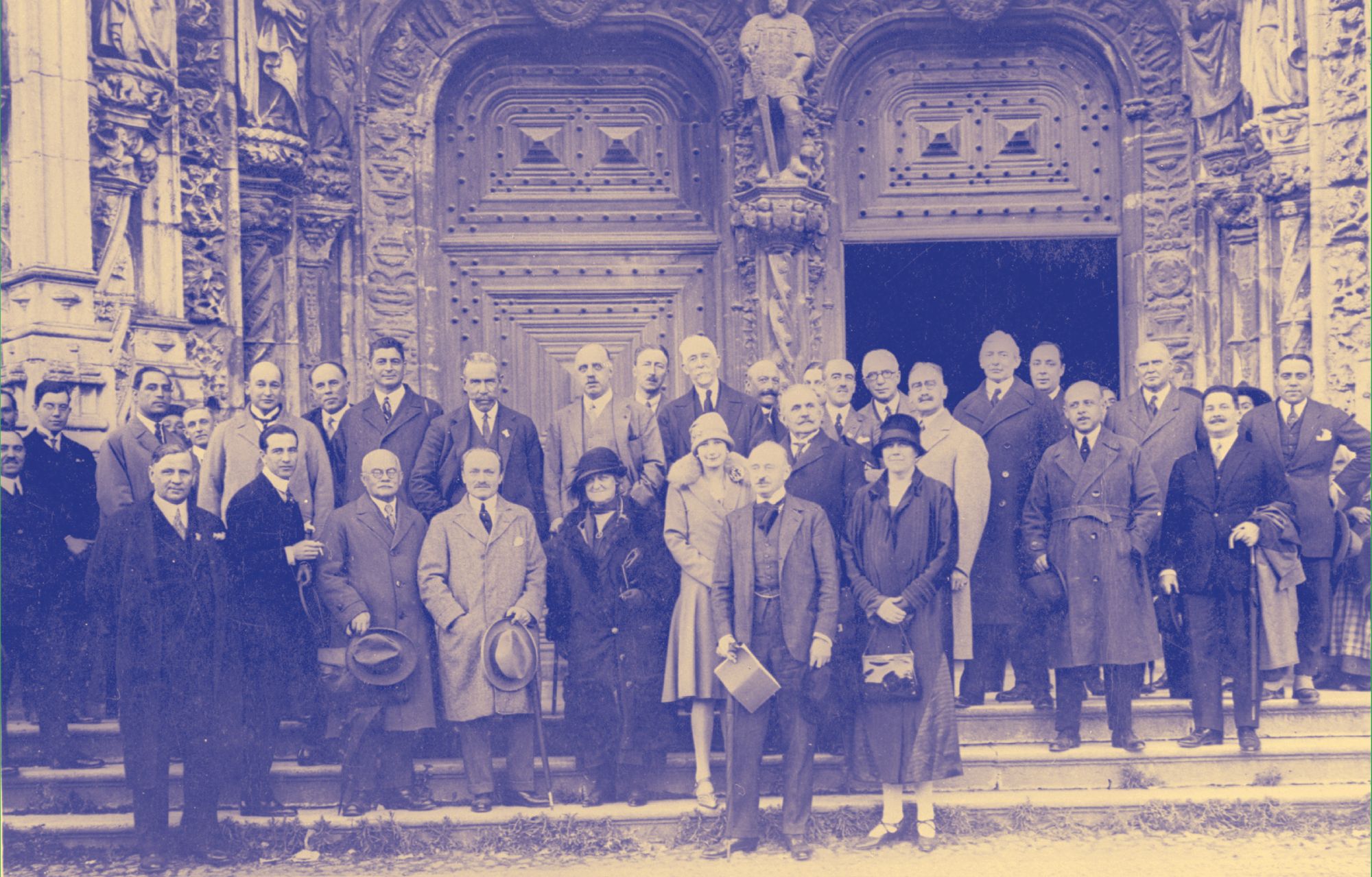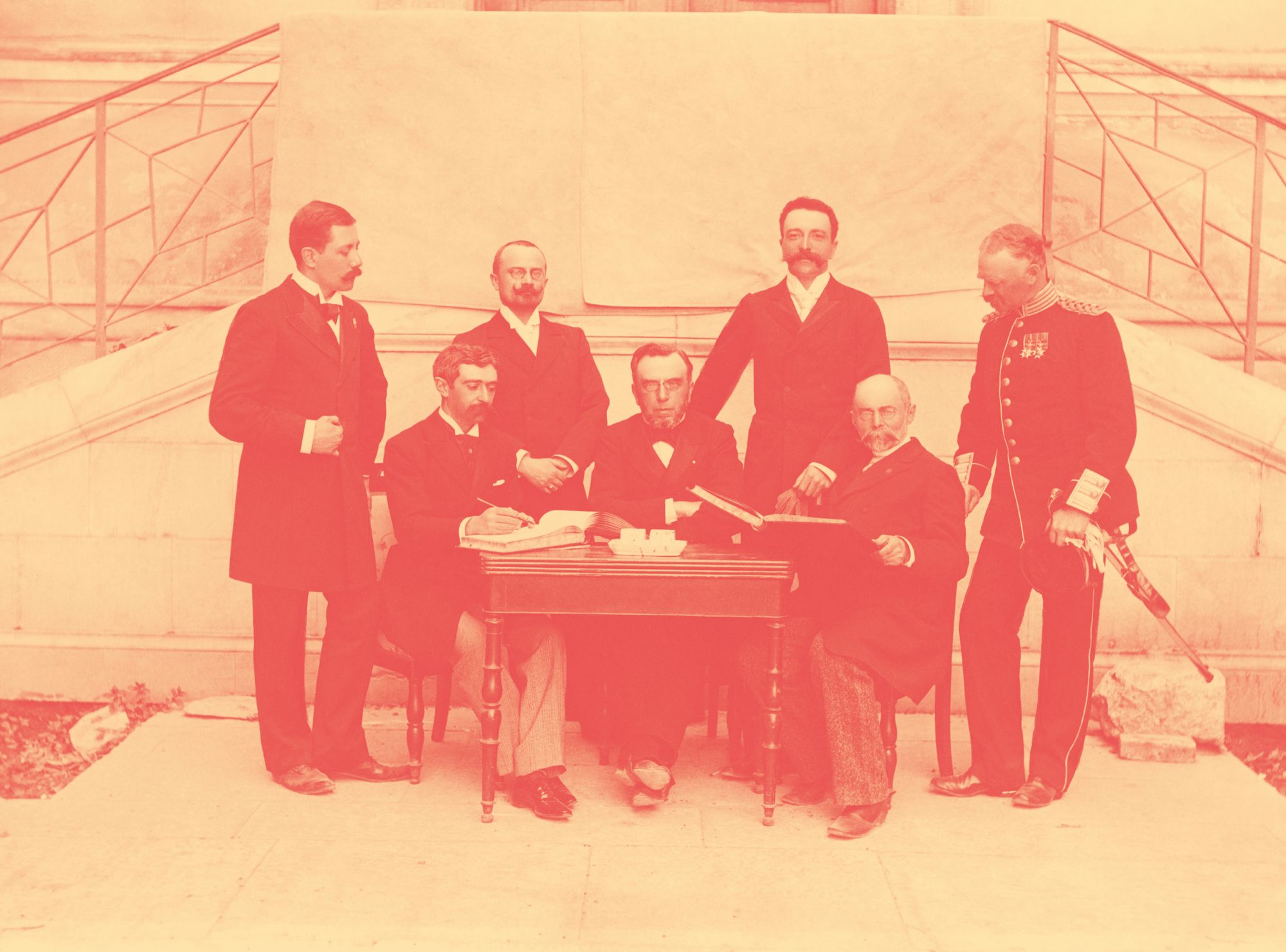 De gauche à droite, assis : Pierre de Coubertin, Demetrius Vikelas et Aleksey Dimitrievic Boutowski ; debout : Karl August Willibald Gebhardt, Jiri Guth-Jarkovsky, Ferenc Kemeny et Viktor Gustav Black.