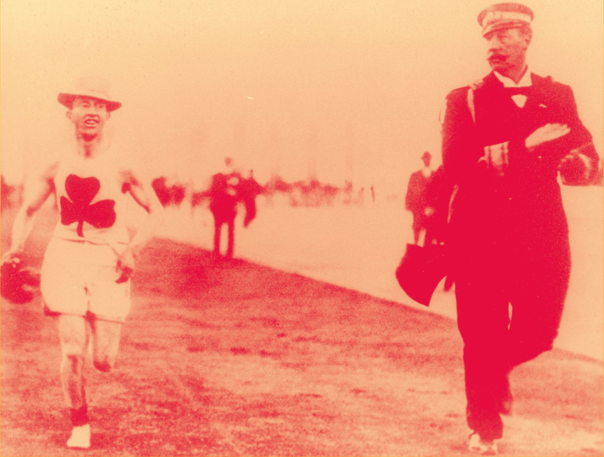 Le prince Georges de Grèce (à droite) court les 50 derniers mètres à ses côtés. Fils de parents irlandais, Sherring est membre du St. Patrick's Athletic Club de Hamilton, dans l’Ontario, dont l'emblème est un grand trèfle.